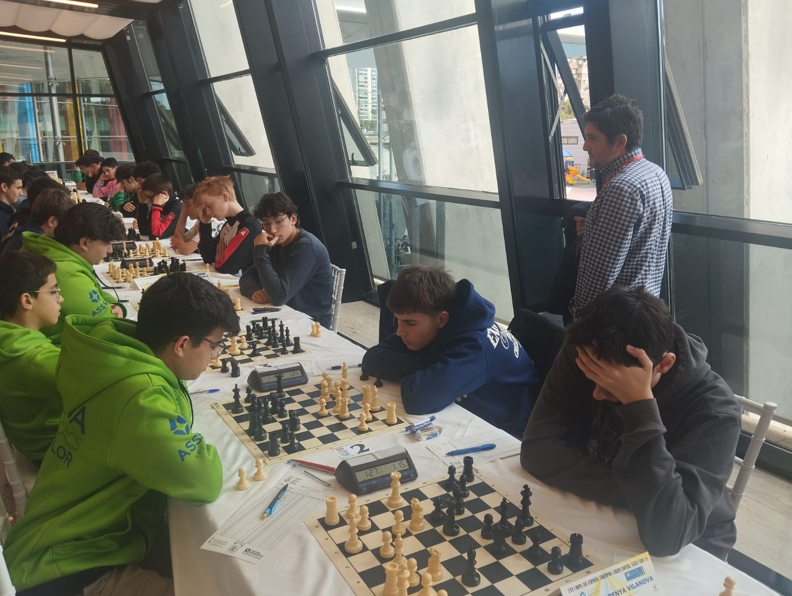Com ja va sent tradició des del 2018, la secció d’escacs ha participat per sisena vegada amb el patrocini de l’Ajuntament de Vilanova i la Geltrú, aquest cop amb 4 equips, un Sub18, un Sub14, un Sub12 i un femení mixtes. Com a novetat, enguany, ja que era el darrer dels Sub18, ens vam allotjar per primer cop a l’hotel oficial, i s’ha de dir que l’hotel estava molt bé però el menjar era horrible… alguns van trobar a faltar el menjar del presi…
