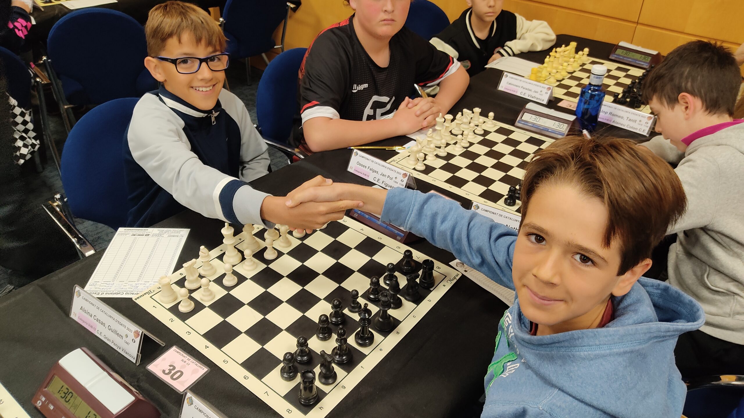 A sub12 bon torneig de Guillem Alsina amb 4,5 punts millorant en 20 posicions el seu rànquing inicial i amb una pujada de 22 punts d’ELO. Tot i començar només amb unes taules en 4 partides (contra l’Oriol i en una posició que guanyava!!) en les 5 restants va fer una bona remuntada amb 4 de 5. Per la seva part, l’Oriol Herrando no va tenir un bon torneig i va acabar amb 4,5 punts però els emparellaments tampoc el van afavorir massa, ja que en la recta final li van tocar 3 jugadors molt durs pels punts que portava. El pròxim any amb una mica més de sort i un bon entrenament segur que acabarà en la part alta de la classificació com li correspon pel seu nivell.
